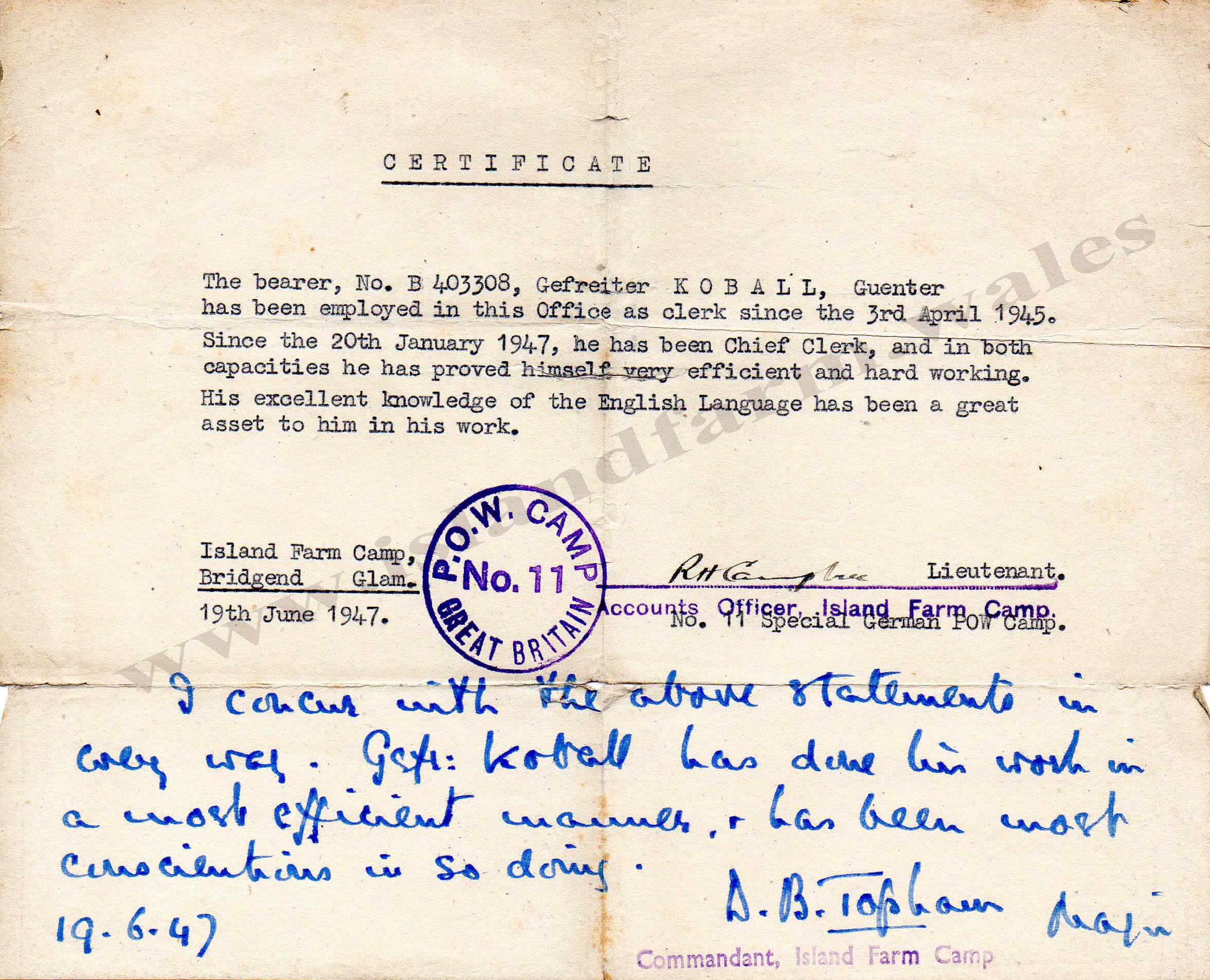 26th February 1948 Certificate of employment Signed by the new Camp Comandant: Col Clemments (previously Major Topham) |