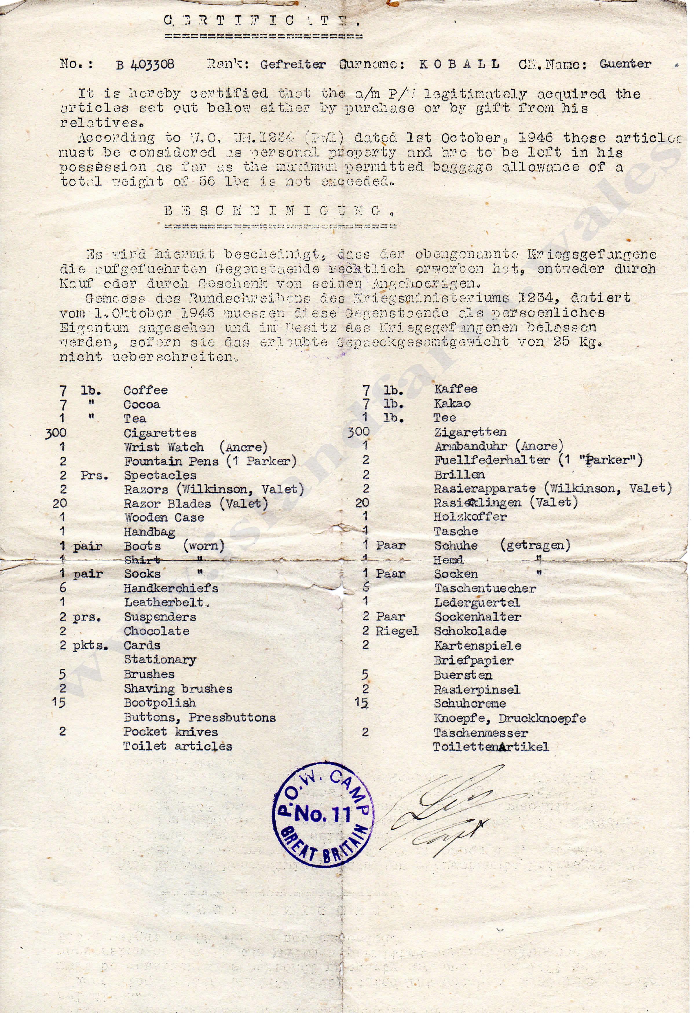 Günter Koball was repatriated: 28th February 1948